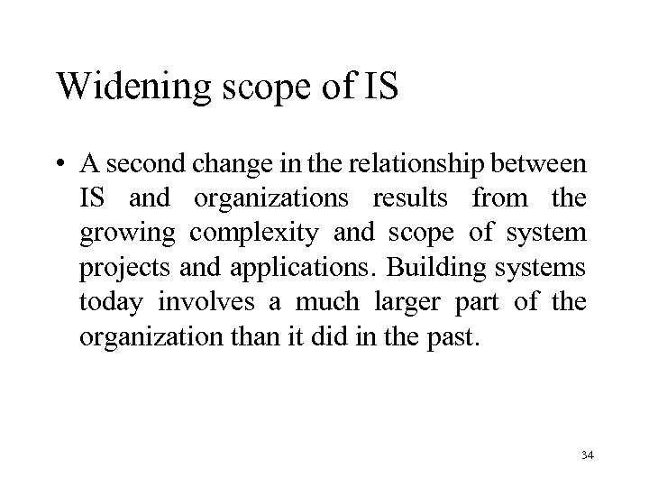 Widening scope of IS • A second change in the relationship between IS and organizations results from the growing complexity and scope of system projects and applications. Building systems today involves a much larger part of the organization than it did in the past. 34