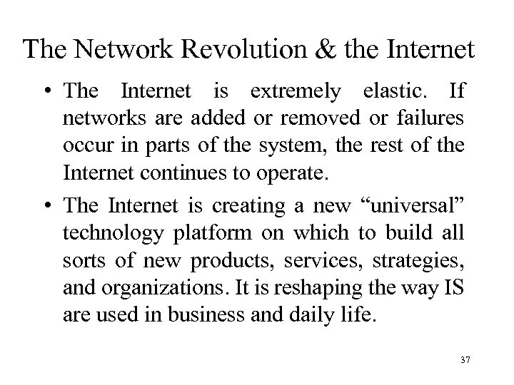 The Network Revolution & the Internet • The Internet is extremely elastic. If networks are added or removed or failures occur in parts of the system, the rest of the Internet continues to operate. • The Internet is creating a new “universal” technology platform on which to build all sorts of new products, services, strategies, and organizations. It is reshaping the way IS are used in business and daily life. 37