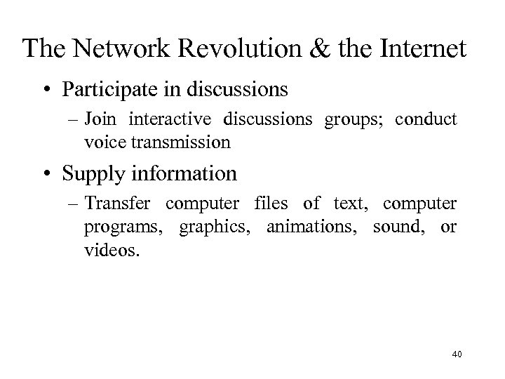 The Network Revolution & the Internet • Communication and collaborate – Send electronic mail messages; transmit documents and data; participate in electronic conferences • Access information – Search for documents, databases, and library card catalogs; read electronic brochures, manuals, books, and advertisements. 39
