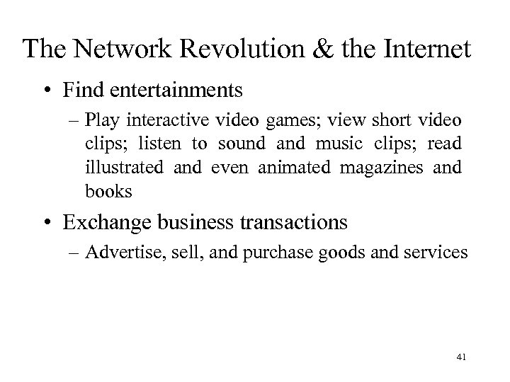 The Network Revolution & the Internet • Participate in discussions – Join interactive discussions groups; conduct voice transmission • Supply information – Transfer computer files of text, computer programs, graphics, animations, sound, or videos. 40