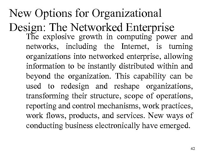 New Options for Organizational Design: The Networked Enterprise The explosive growth in computing power and networks, including the Internet, is turning organizations into networked enterprise, allowing information to be instantly distributed within and beyond the organization. This capability can be used to redesign and reshape organizations, transforming their structure, scope of operations, reporting and control mechanisms, work practices, work flows, products, and services. New ways of conducting business electronically have emerged. 42
