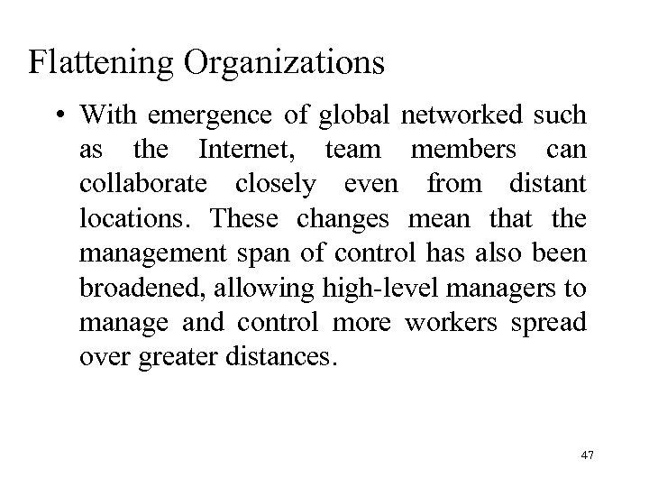 Flattening Organizations • Contemporary IT has made such change possible. It can make more information available to line workers so they can make decisions that previously has been made by managers only. Networked computers have made it possible for employees to work as a team, a feature of flattened organizations. 46