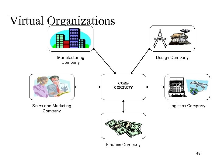 Virtual Organizations Manufacturing Company Design Company CORE COMPANY Sales and Marketing Company Logistics Company Finance Company 48