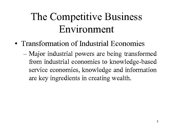 The Competitive Business Environment • Transformation of Industrial Economies – Knowledge and information are becoming the foundation for many new services and products. e. g. computer games, credit cards, overnight packaging delivery, worldwide reservation systems. 7