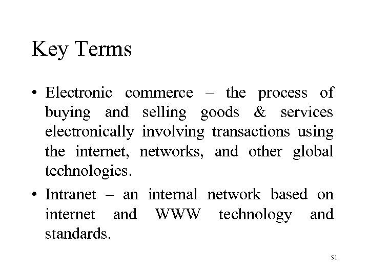 Key Terms • Electronic commerce – the process of buying and selling goods & services electronically involving transactions using the internet, networks, and other global technologies. • Intranet – an internal network based on internet and WWW technology and standards. 51