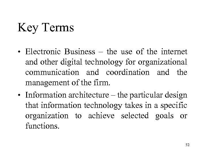 Key Terms • Electronic Business – the use of the internet and other digital technology for organizational communication and coordination and the management of the firm. • Information architecture – the particular design that information technology takes in a specific organization to achieve selected goals or functions. 52