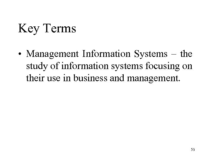 Key Terms • Management Information Systems – the study of information systems focusing on their use in business and management. 53