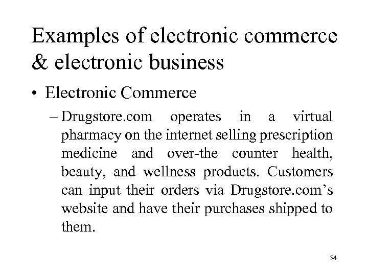 Examples of electronic commerce & electronic business • Electronic Commerce – Drugstore. com operates in a virtual pharmacy on the internet selling prescription medicine and over-the counter health, beauty, and wellness products. Customers can input their orders via Drugstore. com’s website and have their purchases shipped to them. 54