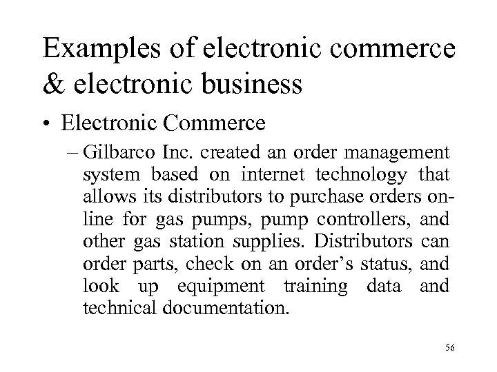 Examples of electronic commerce & electronic business • Electronic Commerce – Gilbarco Inc. created an order management system based on internet technology that allows its distributors to purchase orders online for gas pumps, pump controllers, and other gas station supplies. Distributors can order parts, check on an order’s status, and look up equipment training data and technical documentation. 56