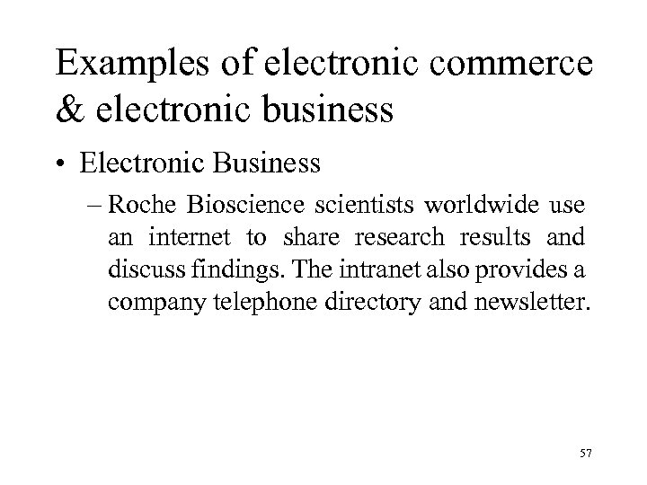 Examples of electronic commerce & electronic business • Electronic Business – Roche Bioscience scientists worldwide use an internet to share research results and discuss findings. The intranet also provides a company telephone directory and newsletter. 57