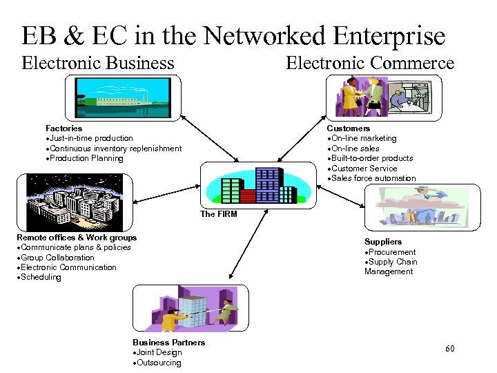 EB & EC in the Networked Enterprise Electronic Business Electronic Commerce Customers ·On-line marketing ·On-line sales ·Built-to-order products ·Customer Service ·Sales force automation Factories ·Just-in-time production ·Continuous inventory replenishment ·Production Planning The FIRM Remote offices & Work groups ·Communicate plans & policies ·Group Collaboration ·Electronic Communication ·Scheduling Business Partners ·Joint Design ·Outsourcing Suppliers ·Procurement ·Supply Chain Management 60