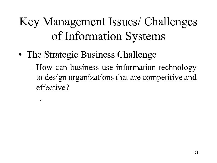 Key Management Issues/ Challenges of Information Systems • The Strategic Business Challenge – How can business use information technology to design organizations that are competitive and effective? . 61