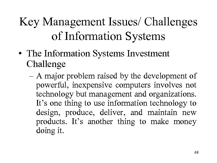 Key Management Issues/ Challenges of Information Systems • The Information Systems Investment Challenge – How can organizations determine the business value of information systems? – How can organizations obtain a sizable payoff from their investment in information systems? 67