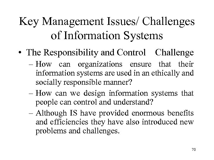 Key Management Issues/ Challenges of Information Systems • The Responsibility and Control Challenge – How can organizations ensure that their information systems are used in an ethically and socially responsible manner? – How can we design information systems that people can control and understand? – Although IS have provided enormous benefits and efficiencies they have also introduced new problems and challenges. 70