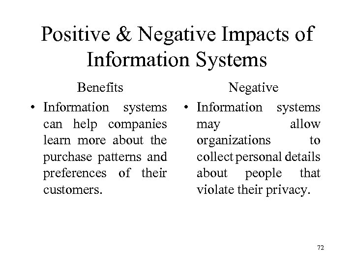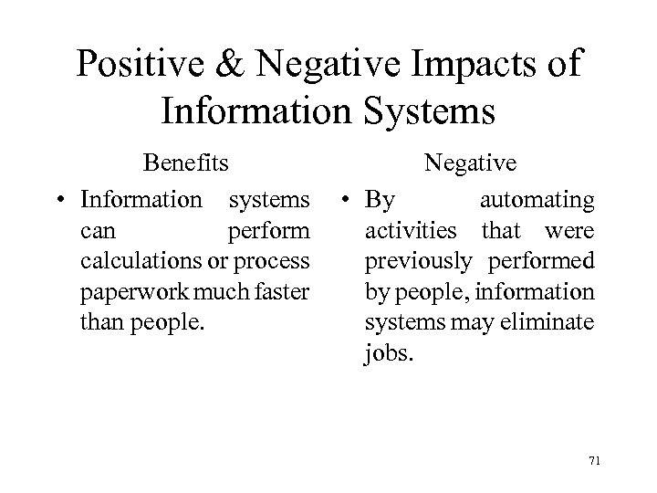 Positive & Negative Impacts of Information Systems Benefits • Information systems can perform calculations or process paperwork much faster than people. Negative • By automating activities that were previously performed by people, information systems may eliminate jobs. 71
