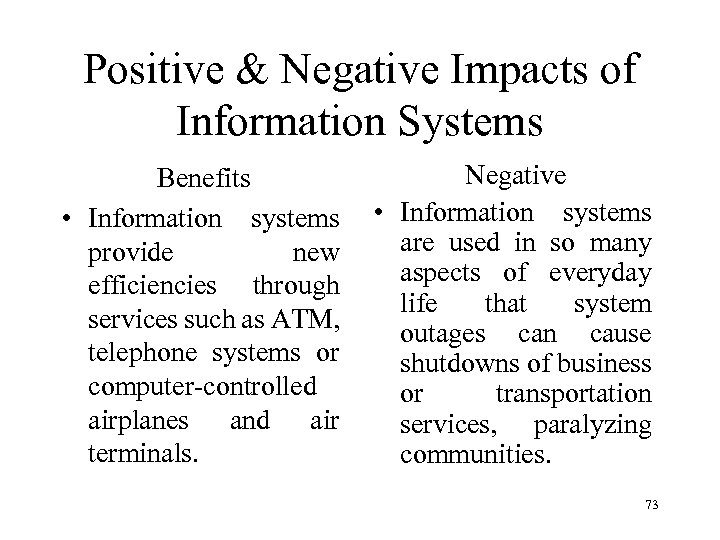 Positive & Negative Impacts of Information Systems Benefits • Information systems can help companies learn more about the purchase patterns and preferences of their customers. Negative • Information systems may allow organizations to collect personal details about people that violate their privacy. 72
