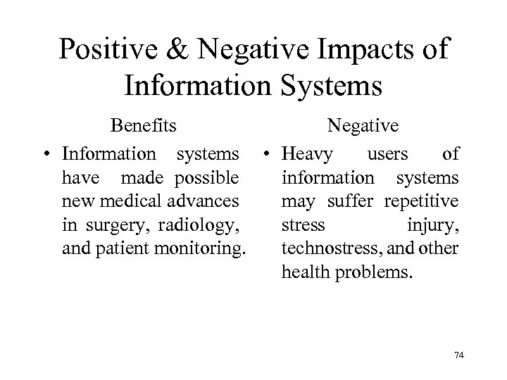 Positive & Negative Impacts of Information Systems Benefits Negative • Information systems • Heavy users of have made possible information systems new medical advances may suffer repetitive in surgery, radiology, stress injury, and patient monitoring. technostress, and other health problems. 74