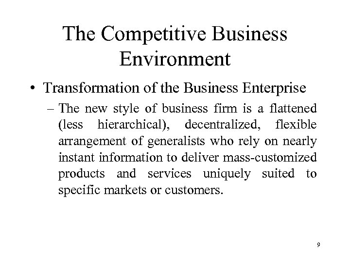 The Competitive Business Environment • Transformation of the Business Enterprise – Traditional business firms was and still – hierarchical, centralized, structured of specialist that typically relies on a fixed set of standard operating procedures to deliver a massproduced products or services. 8