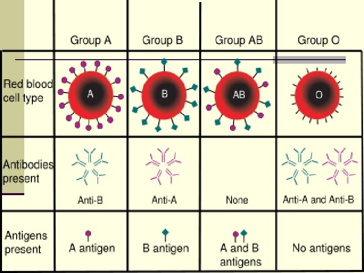 BLOOD GROUP ANTIGEN ANTIBODY A A Anti-B B B Anti-A A, B None H Anti-A, Anti-B AB O Bombay Group None Anti-A, Anti-B, & Anti-H