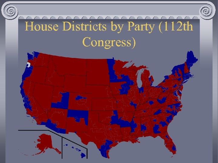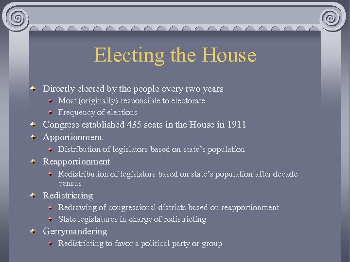 Electing the House Directly elected by the people every two years Most (originally) responsible to electorate Frequency of elections Congress established 435 seats in the House in 1911 Apportionment Distribution of legislators based on state’s population Reapportionment Redistribution of legislators based on state’s population after decade census Redistricting Redrawing of congressional districts based on reapportionment State legislatures in charge of redistricting Gerrymandering Redistricting to favor a political party or group