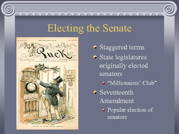 Electing the Senate Staggered terms State legislatures originally elected senators “Millionaires’ Club” Seventeenth Amendment Popular election of senators