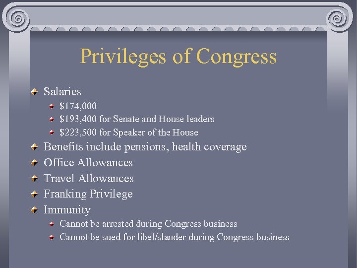 Privileges of Congress Salaries $174, 000 $193, 400 for Senate and House leaders $223, 500 for Speaker of the House Benefits include pensions, health coverage Office Allowances Travel Allowances Franking Privilege Immunity Cannot be arrested during Congress business Cannot be sued for libel/slander during Congress business