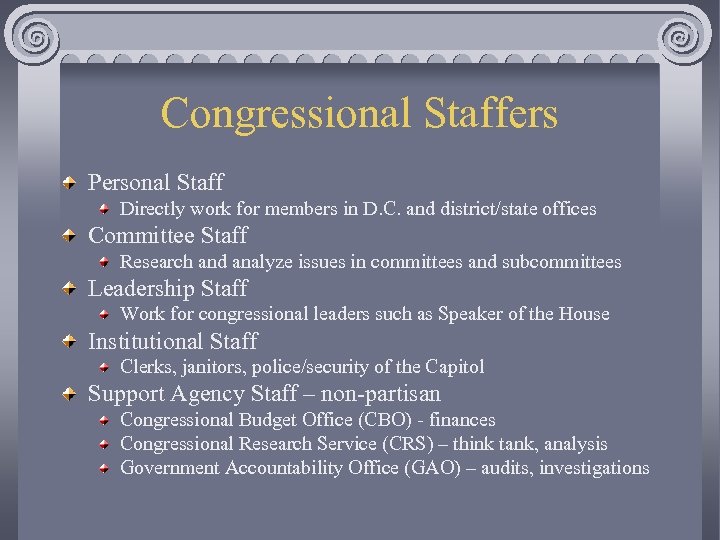 Congressional Staffers Personal Staff Directly work for members in D. C. and district/state offices Committee Staff Research and analyze issues in committees and subcommittees Leadership Staff Work for congressional leaders such as Speaker of the House Institutional Staff Clerks, janitors, police/security of the Capitol Support Agency Staff – non-partisan Congressional Budget Office (CBO) - finances Congressional Research Service (CRS) – think tank, analysis Government Accountability Office (GAO) – audits, investigations