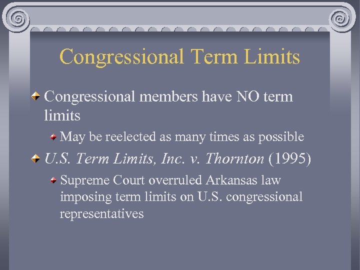 Congressional Term Limits Congressional members have NO term limits May be reelected as many times as possible U. S. Term Limits, Inc. v. Thornton (1995) Supreme Court overruled Arkansas law imposing term limits on U. S. congressional representatives