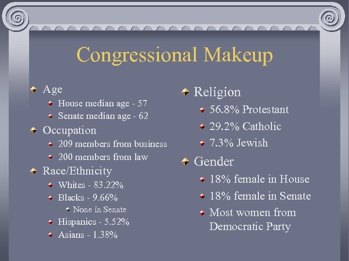 Congressional Makeup Age House median age - 57 Senate median age - 62 Occupation 209 members from business 200 members from law Race/Ethnicity Whites - 83. 22% Blacks - 9. 66% None in Senate Hispanics - 5. 52% Asians - 1. 38% Religion 56. 8% Protestant 29. 2% Catholic 7. 3% Jewish Gender 18% female in House 18% female in Senate Most women from Democratic Party