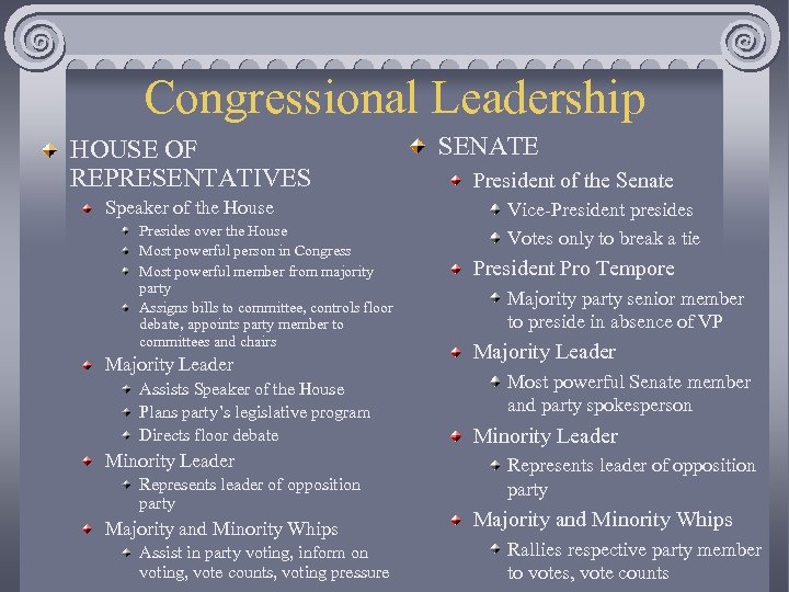 Congressional Leadership HOUSE OF REPRESENTATIVES Speaker of the House Presides over the House Most powerful person in Congress Most powerful member from majority party Assigns bills to committee, controls floor debate, appoints party member to committees and chairs Majority Leader Assists Speaker of the House Plans party’s legislative program Directs floor debate Minority Leader Represents leader of opposition party Majority and Minority Whips Assist in party voting, inform on voting, vote counts, voting pressure SENATE President of the Senate Vice-President presides Votes only to break a tie President Pro Tempore Majority party senior member to preside in absence of VP Majority Leader Most powerful Senate member and party spokesperson Minority Leader Represents leader of opposition party Majority and Minority Whips Rallies respective party member to votes, vote counts