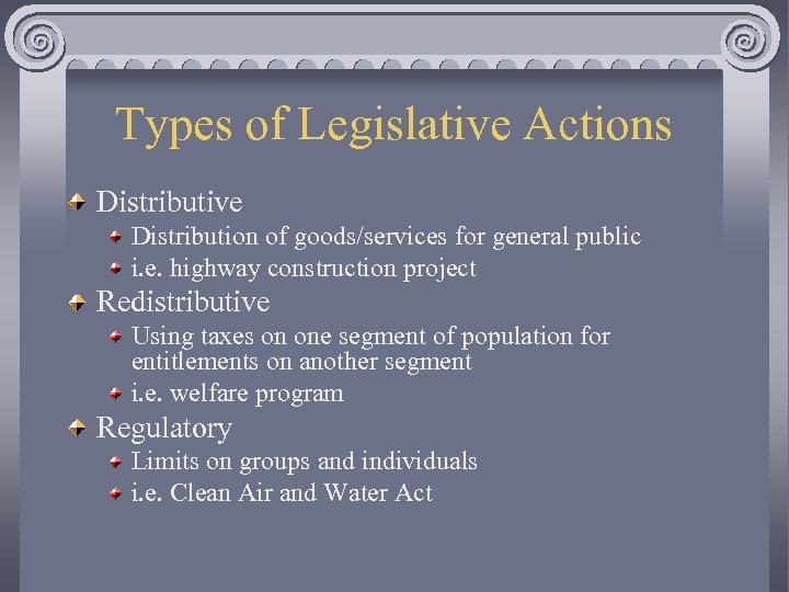 Types of Legislative Actions Distributive Distribution of goods/services for general public i. e. highway construction project Redistributive Using taxes on one segment of population for entitlements on another segment i. e. welfare program Regulatory Limits on groups and individuals i. e. Clean Air and Water Act