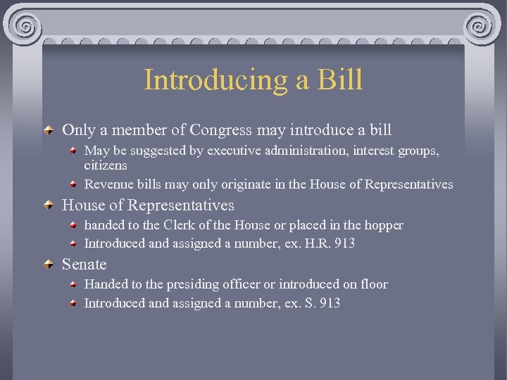 Introducing a Bill Only a member of Congress may introduce a bill May be suggested by executive administration, interest groups, citizens Revenue bills may only originate in the House of Representatives handed to the Clerk of the House or placed in the hopper Introduced and assigned a number, ex. H. R. 913 Senate Handed to the presiding officer or introduced on floor Introduced and assigned a number, ex. S. 913