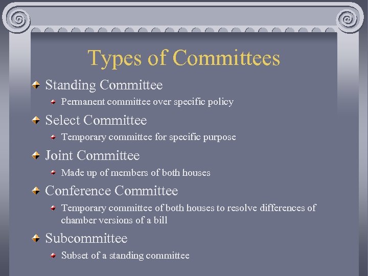 Types of Committees Standing Committee Permanent committee over specific policy Select Committee Temporary committee for specific purpose Joint Committee Made up of members of both houses Conference Committee Temporary committee of both houses to resolve differences of chamber versions of a bill Subcommittee Subset of a standing committee
