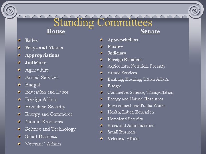 Standing Committees House Rules Ways and Means Appropriations Judiciary Agriculture Armed Services Budget Education and Labor Foreign Affairs Homeland Security Energy and Commerce Natural Resources Science and Technology Small Business Veterans’ Affairs Senate Appropriations Finance Judiciary Foreign Relations Agriculture, Nutrition, Forestry Armed Services Banking, Housing, Urban Affairs Budget Commerce, Science, Transportation Energy and Natural Resources Environment and Public Works Health, Labor, Education Homeland Security Rules and Administration Small Business Veterans’ Affairs