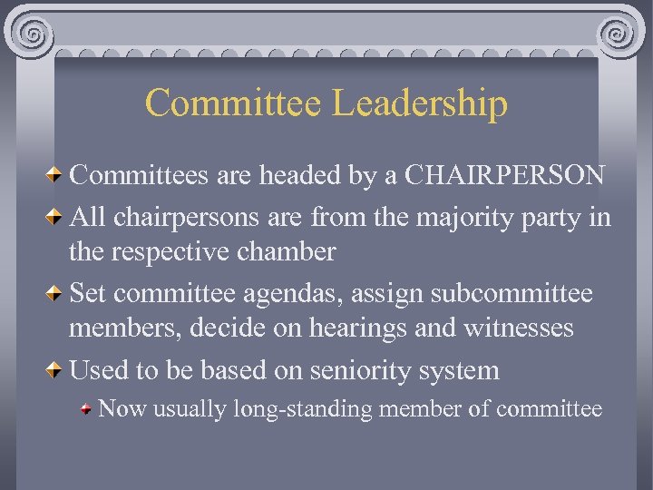 Committee Leadership Committees are headed by a CHAIRPERSON All chairpersons are from the majority party in the respective chamber Set committee agendas, assign subcommittee members, decide on hearings and witnesses Used to be based on seniority system Now usually long-standing member of committee