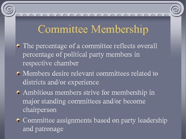 Committee Membership The percentage of a committee reflects overall percentage of political party members in respective chamber Members desire relevant committees related to districts and/or experience Ambitious members strive for membership in major standing committees and/or become chairperson Committee assignments based on party leadership and patronage