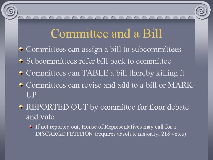 Committee and a Bill Committees can assign a bill to subcommittees Subcommittees refer bill back to committee Committees can TABLE a bill thereby killing it Committees can revise and add to a bill or MARKUP REPORTED OUT by committee for floor debate and vote If not reported out, House of Representatives may call for a DISCARGE PETITION (requires absolute majority, 218 votes)