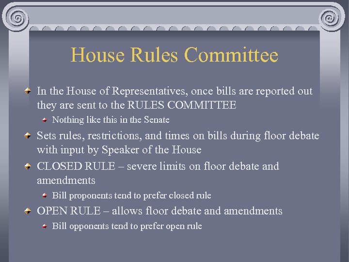 House Rules Committee In the House of Representatives, once bills are reported out they are sent to the RULES COMMITTEE Nothing like this in the Senate Sets rules, restrictions, and times on bills during floor debate with input by Speaker of the House CLOSED RULE – severe limits on floor debate and amendments Bill proponents tend to prefer closed rule OPEN RULE – allows floor debate and amendments Bill opponents tend to prefer open rule