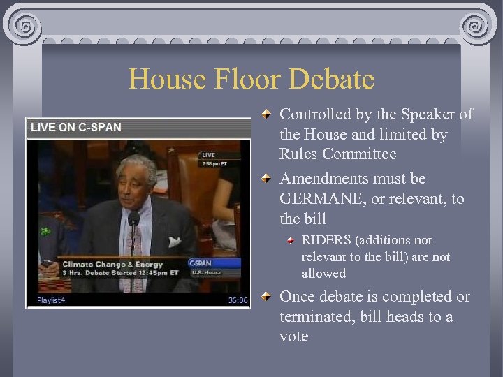 House Floor Debate Controlled by the Speaker of the House and limited by Rules Committee Amendments must be GERMANE, or relevant, to the bill RIDERS (additions not relevant to the bill) are not allowed Once debate is completed or terminated, bill heads to a vote