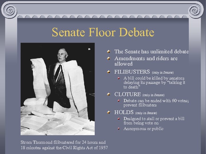 Senate Floor Debate The Senate has unlimited debate Amendments and riders are allowed FILIBUSTERS (only in Senate) A bill could be killed by senators delaying its passage by “talking it to death” CLOTURE (only in Senate) Debate can be ended with 60 votes; prevent filibusters HOLDS (only in Senate) Designed to stall or prevent a bill from being vote on Anonymous or public Strom Thurmond filibustered for 24 hours and 18 minutes against the Civil Rights Act of 1957