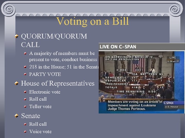 Voting on a Bill QUORUM/QUORUM CALL A majority of members must be present to vote, conduct business 218 in the House; 51 in the Senate PARTY VOTE House of Representatives Electronic vote Roll call Teller vote Senate Roll call Voice vote