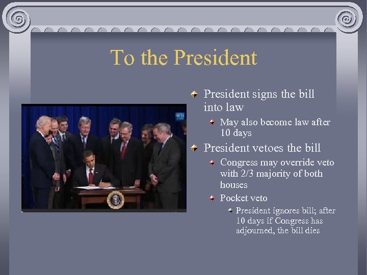 To the President signs the bill into law May also become law after 10 days President vetoes the bill Congress may override veto with 2/3 majority of both houses Pocket veto President ignores bill; after 10 days if Congress has adjourned, the bill dies