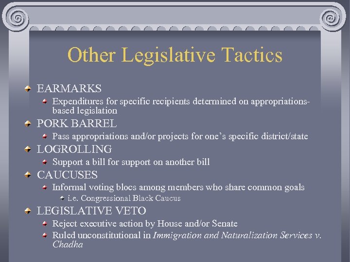 Other Legislative Tactics EARMARKS Expenditures for specific recipients determined on appropriationsbased legislation PORK BARREL Pass appropriations and/or projects for one’s specific district/state LOGROLLING Support a bill for support on another bill CAUCUSES Informal voting blocs among members who share common goals i. e. Congressional Black Caucus LEGISLATIVE VETO Reject executive action by House and/or Senate Ruled unconstitutional in Immigration and Naturalization Services v. Chadha