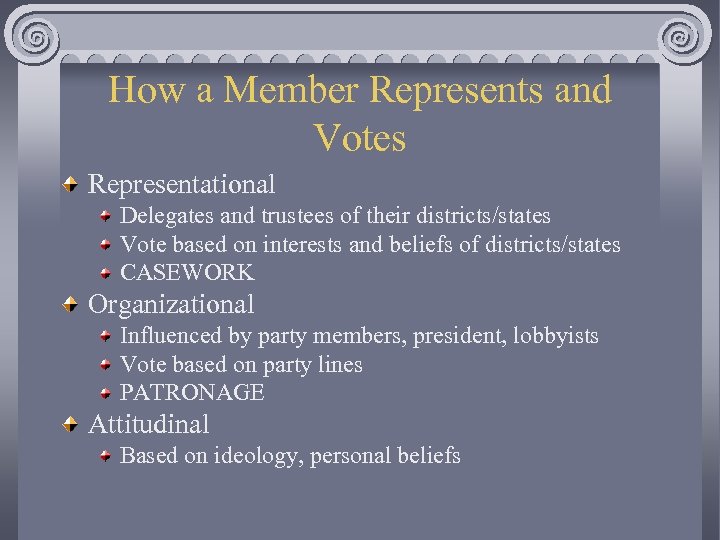 How a Member Represents and Votes Representational Delegates and trustees of their districts/states Vote based on interests and beliefs of districts/states CASEWORK Organizational Influenced by party members, president, lobbyists Vote based on party lines PATRONAGE Attitudinal Based on ideology, personal beliefs