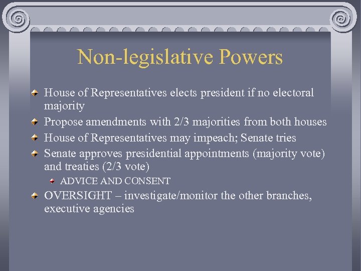 Non-legislative Powers House of Representatives elects president if no electoral majority Propose amendments with 2/3 majorities from both houses House of Representatives may impeach; Senate tries Senate approves presidential appointments (majority vote) and treaties (2/3 vote) ADVICE AND CONSENT OVERSIGHT – investigate/monitor the other branches, executive agencies