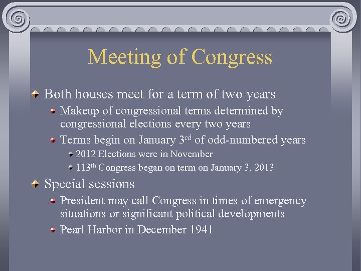 Meeting of Congress Both houses meet for a term of two years Makeup of congressional terms determined by congressional elections every two years Terms begin on January 3 rd of odd-numbered years 2012 Elections were in November 113 th Congress began on term on January 3, 2013 Special sessions President may call Congress in times of emergency situations or significant political developments Pearl Harbor in December 1941