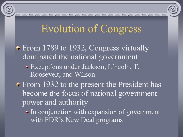 Evolution of Congress From 1789 to 1932, Congress virtually dominated the national government Exceptions under Jackson, Lincoln, T. Roosevelt, and Wilson From 1932 to the present the President has become the focus of national government power and authority In conjunction with expansion of government with FDR’s New Deal programs