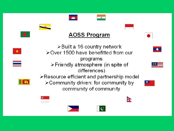 Asia OSS Training programs #1 Kuala Lumpur, Malaysia, March 2005 #2 Singapore, July 2005 #3 Sri Lanka, December 2005 #4 Thailand, January 2006 #5 Chennai, India, May 2006 #6 Mumbai, India, Aug 2006 #7 Malaysia, Sept 2006 #8 Yogyakarta, Indonesia, Feb 2007 #9 Katmandu, Nepal, March 2007 #10 Colombo, Sri Lanka, May 2007 #11 Brunei, June 2007 #12 Vietnam, July 2007 #13 Bangkok, November 2007 #14 Philippines, November 2007 #15 Chennai, India, Jan 2008 #16 Samerang, Indonesia, August 2008 #17 Hanoi, Vietnam, September 2008 #18 Kathmandu, Nepal, February 2009 #19 Phnom Penh, Cambodia, February 2009