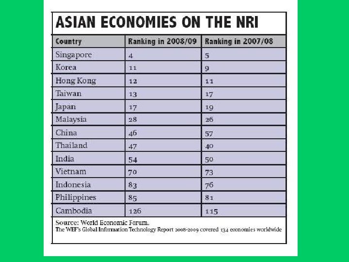 Singapore stands out • Fourth on the Networked-Readiness Index (NRI) of the Global Information Technology Report 2008 -2009, which was produced by the World Economic Forum (WEF)