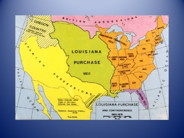 The West in 1800 • • • Many settlers move to region between Appalachians, Mississippi River, 1 million by 1800 Kentucky, Tennessee become states (1800), Ohio becomes state (1803) France, Spain want Louisiana Territory, Britain claims land in region